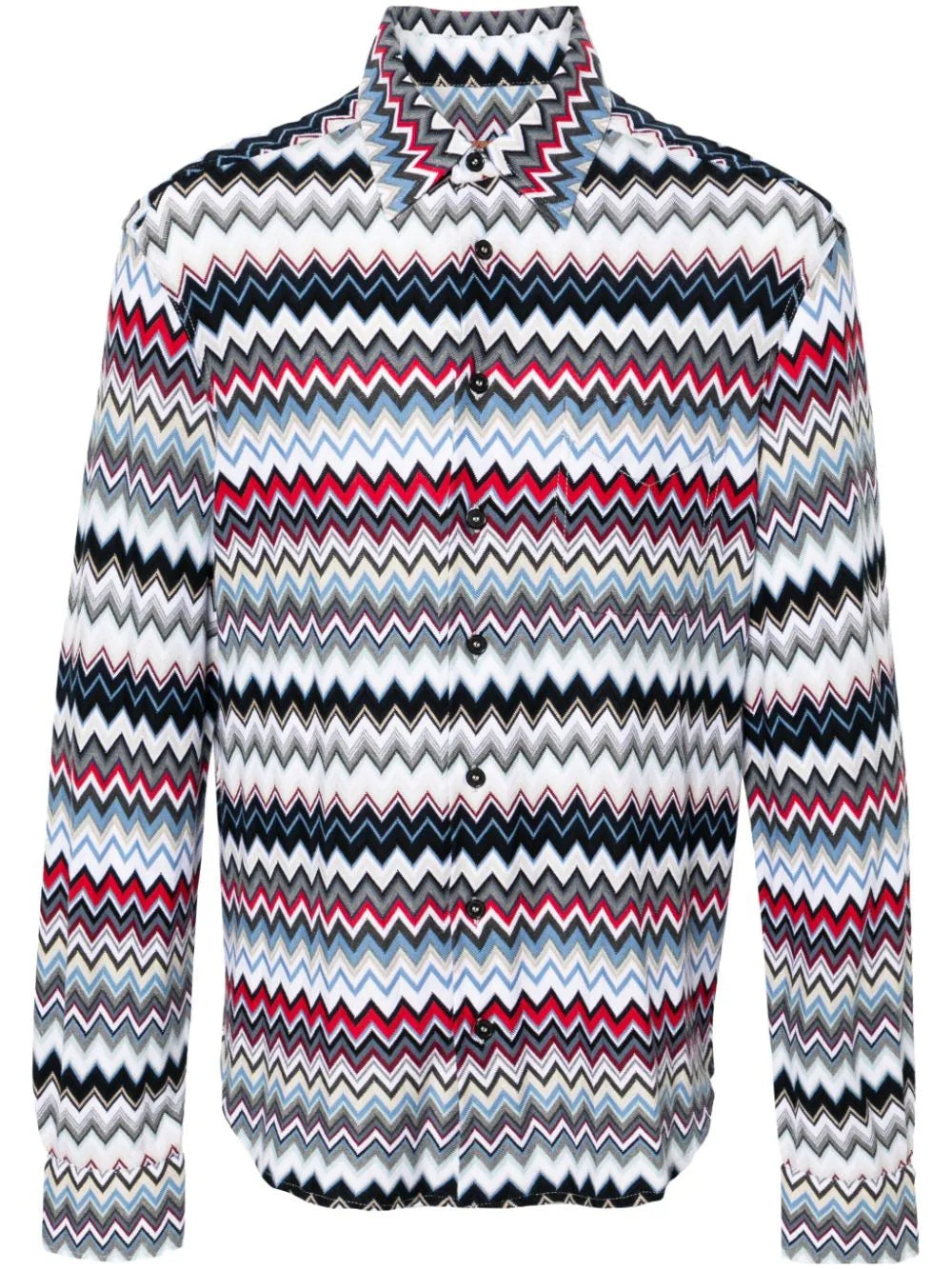 RED/MULTICOLOUR COTTON CHEVRON KNIT CLASSIC COLLAR FRONT BUTTON FASTENING LONG SLEEVES WITH BUTTONED CUFFS CHEST PATCH POCKET CURVED HEM THE ITEM YOU RECEIVE MAY DIFFER SLIGHTLY FROM THE ITEM PHOTOGRAPHED. THIS IS DUE TO THE ARTISANAL NATURE WITH WHICH ALL MISSONI PRODUCTS ARE CONSTRUCTED.