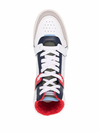 WHITE LEATHER HIGH-TOP PANELLED SNEAKERS FROM MISSONI FEATURING PANELLED DESIGN, LOGO PATCH AT THE TONGUE, PERFORATED, FRONT LACE-UP FASTENING, FLAT RUBBER SOLE AND ROUND TOE.