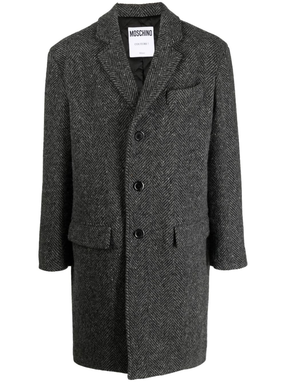 SLOGAN-PRINT WOOL PEACOAT FROM MOSCHINO FEATURING BLACK, VIRGIN WOOL, HERRINGBONE PATTERN, SLOGAN PRINT TO THE REAR, NOTCHED LAPELS, FRONT BUTTON FASTENING, LONG SLEEVES, CHEST WELT POCKET AND TWO FRONT FLAP POCKETS.