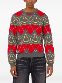THIS RED AND GREY WOOL SWEATER FEATURES A DISTINCTIVE RED HEART PATTERN COMBINED WITH A PLAYFUL SMILEY-FACE MOTIF AND A CLASSIC DIAMOND DESIGN. THE CREW NECK SILHOUETTE OFFERS A TIMELESS FIT, WHILE THE PREMIUM WOOL ENSURES WARMTH AND COMFORT, MAKING IT A STYLISH AND COZY CHOICE FOR COOLER DAYS.