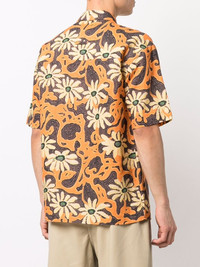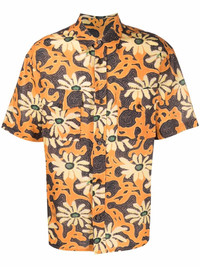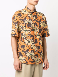 ORANGE / YELLOW / BROWN COTTON-LINEN BLEND FLORAL PRINT SHIRT FROM NANUSHKA FEATURING ALL-OVER FLORAL PRINT, CLASSIC COLLAR, FRONT BUTTON FASTENING, SHORT SLEEVES, TWO CHEST FLAP POCKETS AND STRAIGHT HEM.