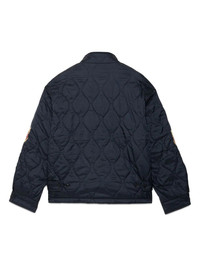 NAVY BLUE PADDED DESIGN QUILTED FRONT TWO-WAY ZIP FASTENING BAND COLLAR EMBROIDERED LOGO AT THE CHEST EMBROIDERED MOTIF DROP SHOULDER LONG SLEEVES TWO SIDE FLAP POCKETS STRAIGHT HEM