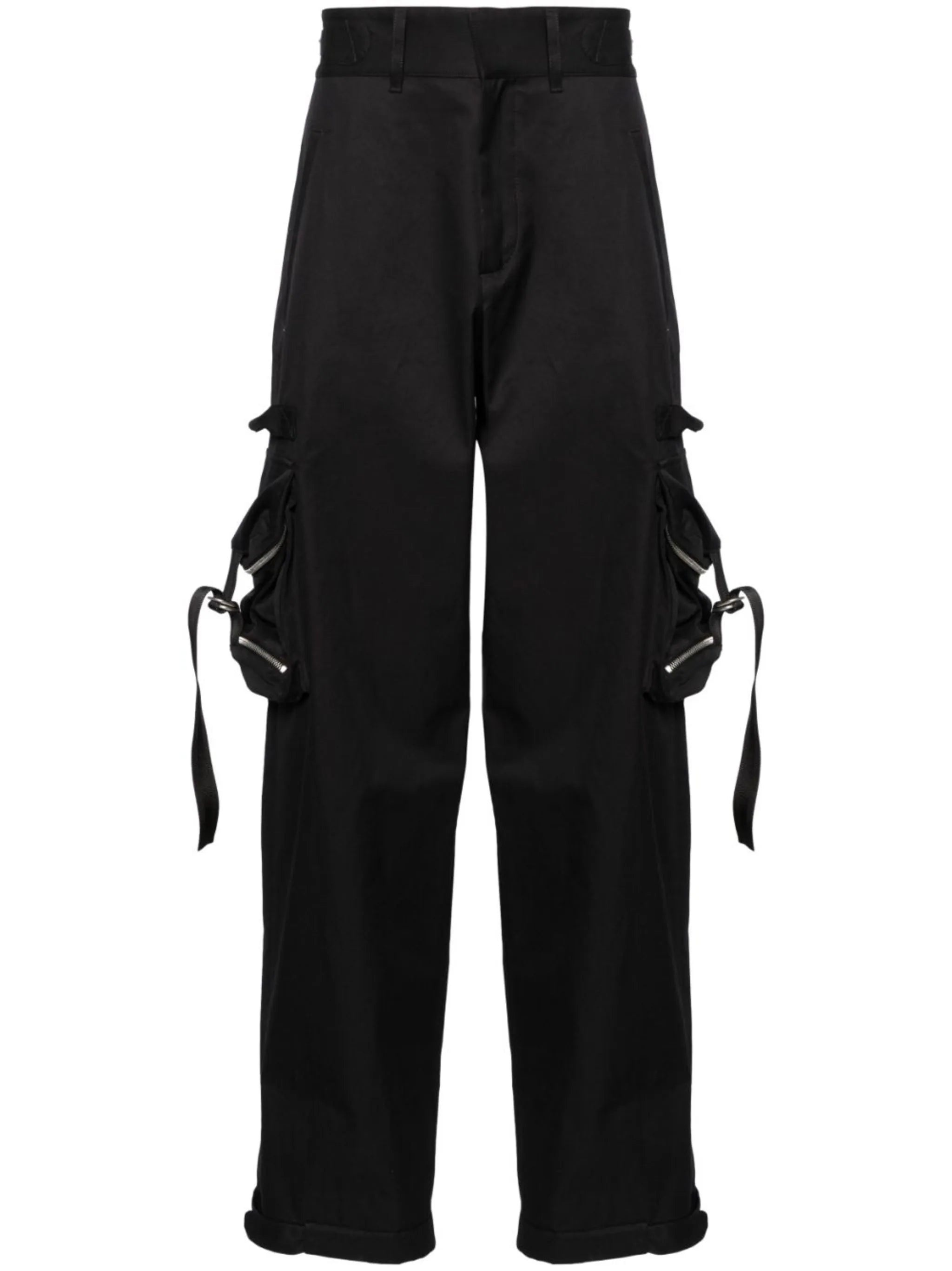 BLACK COTTON TWILL WEAVE CONCEALED FRONT FASTENING DECORATIVE-BUTTON WAIST TABS BELT LOOPS STRAIGHT LEG TWO FRONT WELT POCKETS TWO SIDE CARGO POCKETS TWO REAR WELT POCKETS PRESS-STUD FASTENING CUFFS