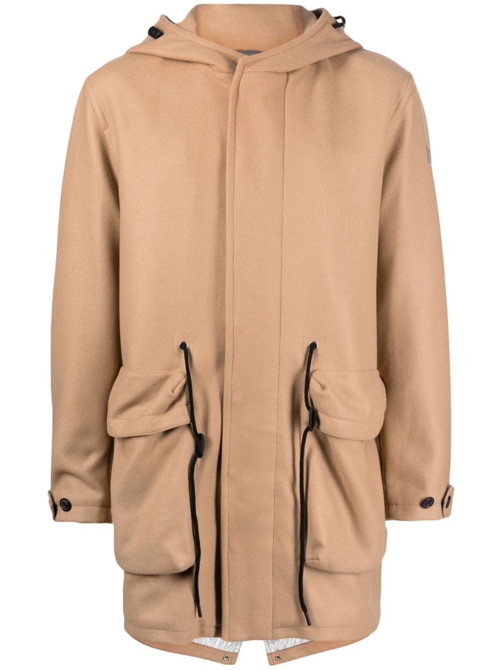 BEIGE WOOL BLEND TONAL STITCHING DRAWSTRING WAIST CLASSIC HOOD CONCEALED FRONT FASTENING LONG SLEEVES BUTTONED CUFFS TWO FRONT FLAP POCKETS REAR SHORT SLIT REAR CURVED HEM