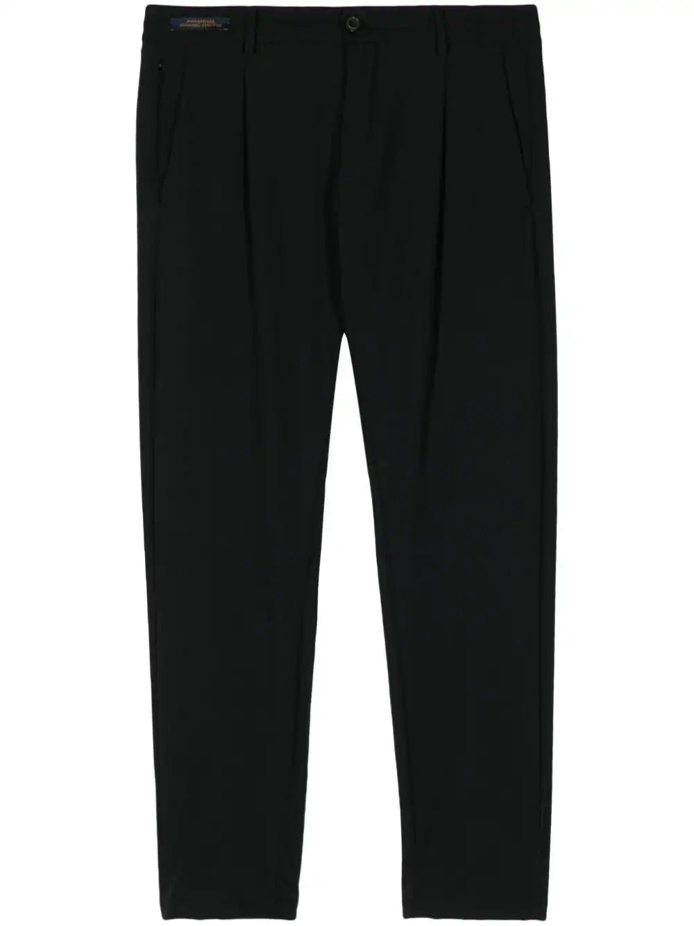 BLACK STRETCH-DESIGN PLEAT DETAILING APPLIQUE LOGO BELT LOOPS CONCEALED FLY AND BUTTON FASTENING STRAIGHT LEG TWO SIDE INSET POCKETS TWO REAR FLAP POCKETS