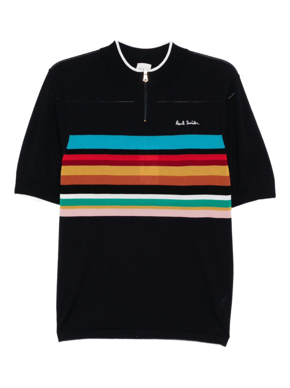 THE LOGO-EMBROIDERED STRIPED TOP FEATURES A DEEP DARK BLUE SHADE WITH SHORT SLEEVES AND A HALF FRONT ZIP FASTENING FOR ADJUSTABLE COMFORT AND STYLE. ITS STRAIGHT HEM ENSURES A CLEAN, TAILORED FINISH, WHILE THE SUBTLE LOGO EMBROIDERY ADDS A TOUCH OF SOPHISTICATION. THIS TOP COMBINES CONTEMPORARY DESIGN WITH PRACTICAL DETAILS, MAKING IT A REFINED CHOICE FOR VERSATILE WEAR.