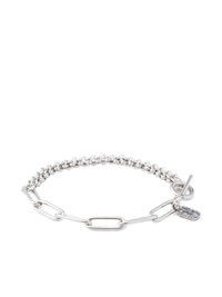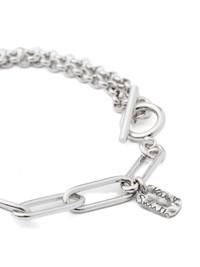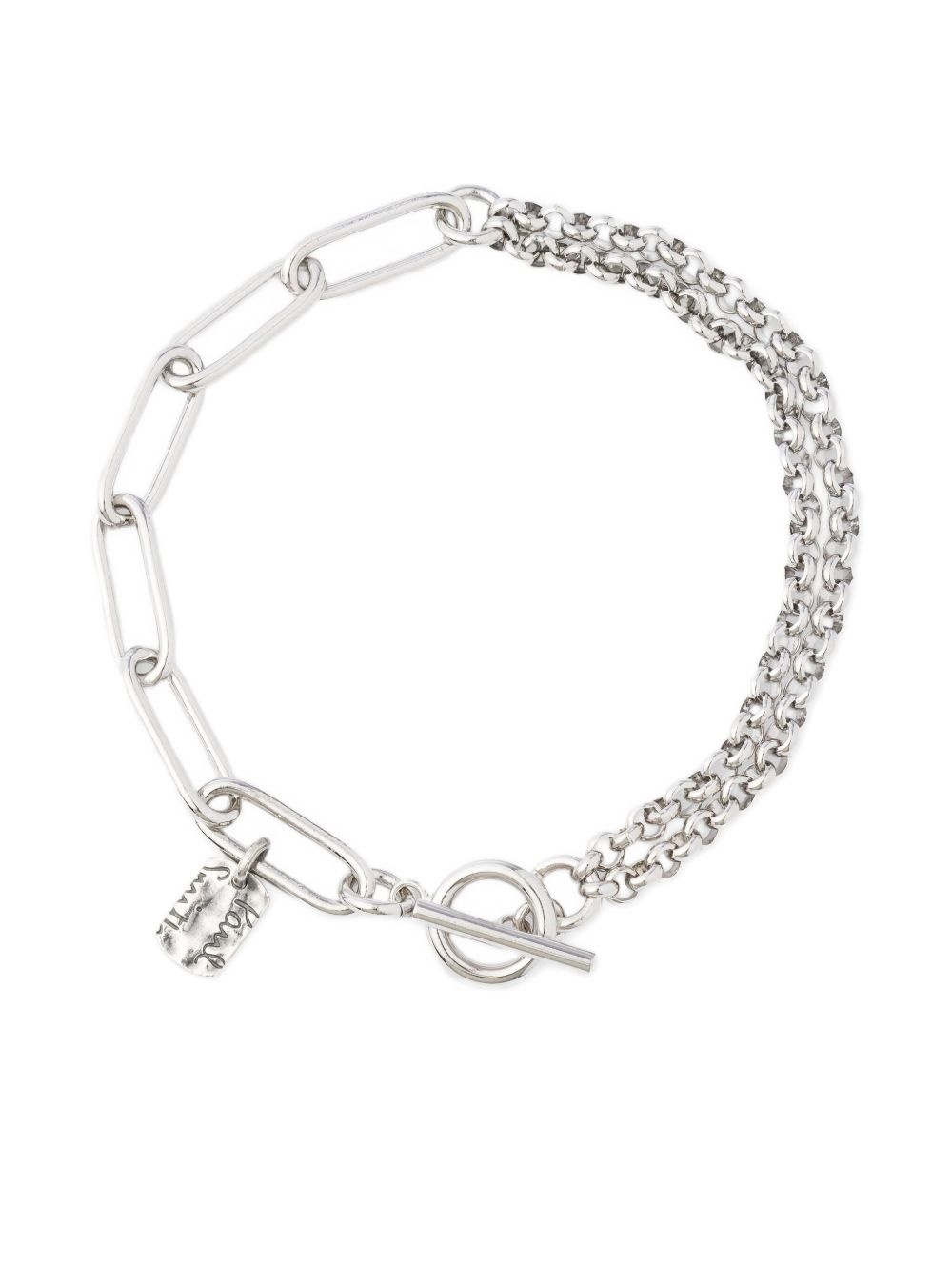 THIS SILVER TWO-CHAIN TOGGLE BRACELET FEATURES AN ELEGANT CHAIN-LINK DESIGN WITH OVAL LINKS AND A DISTINCTIVE DOUBLE CHAIN DETAIL. THE TOGGLE FASTENING ENSURES SECURE WEAR, WHILE THE ENGRAVED TAG ADDS A REFINED, PERSONALIZED TOUCH. A SOPHISTICATED ACCESSORY THAT COMPLEMENTS BOTH CASUAL AND FORMAL STYLES.