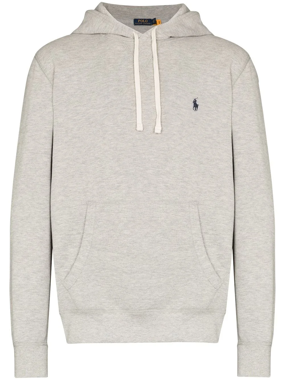HEATHER-GREY COTTON-BLEND POLO PONY DRAWSTRING HOODIE FROM POLO RALPH LAUREN FEATURING MELANGE EFFECT, SIGNATURE POLO PONY MOTIF, DRAWSTRING HOOD, LONG SLEEVES, FRONT POUCH POCKET AND STRAIGHT HEM.