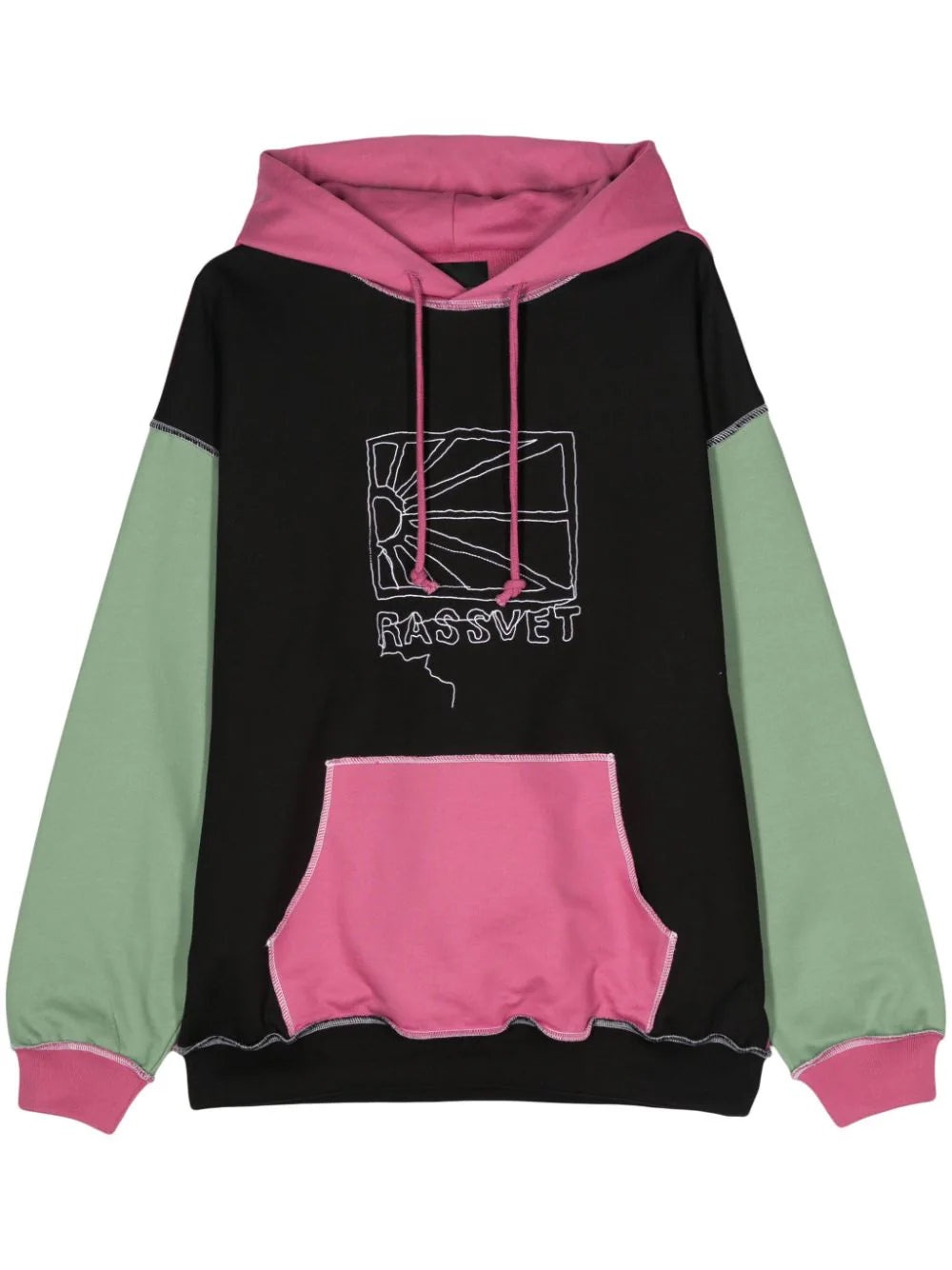 BLACK/PINK/GREEN COTTON JERSEY TEXTURE SEAM DETAILING EMBROIDERED LOGO TO THE FRONT SLOUCHY DRAWSTRING HOOD DROP SHOULDER LONG SLEEVES RIBBED CUFFS AND HEM FRONT POUCH POCKET STRAIGHT HEM