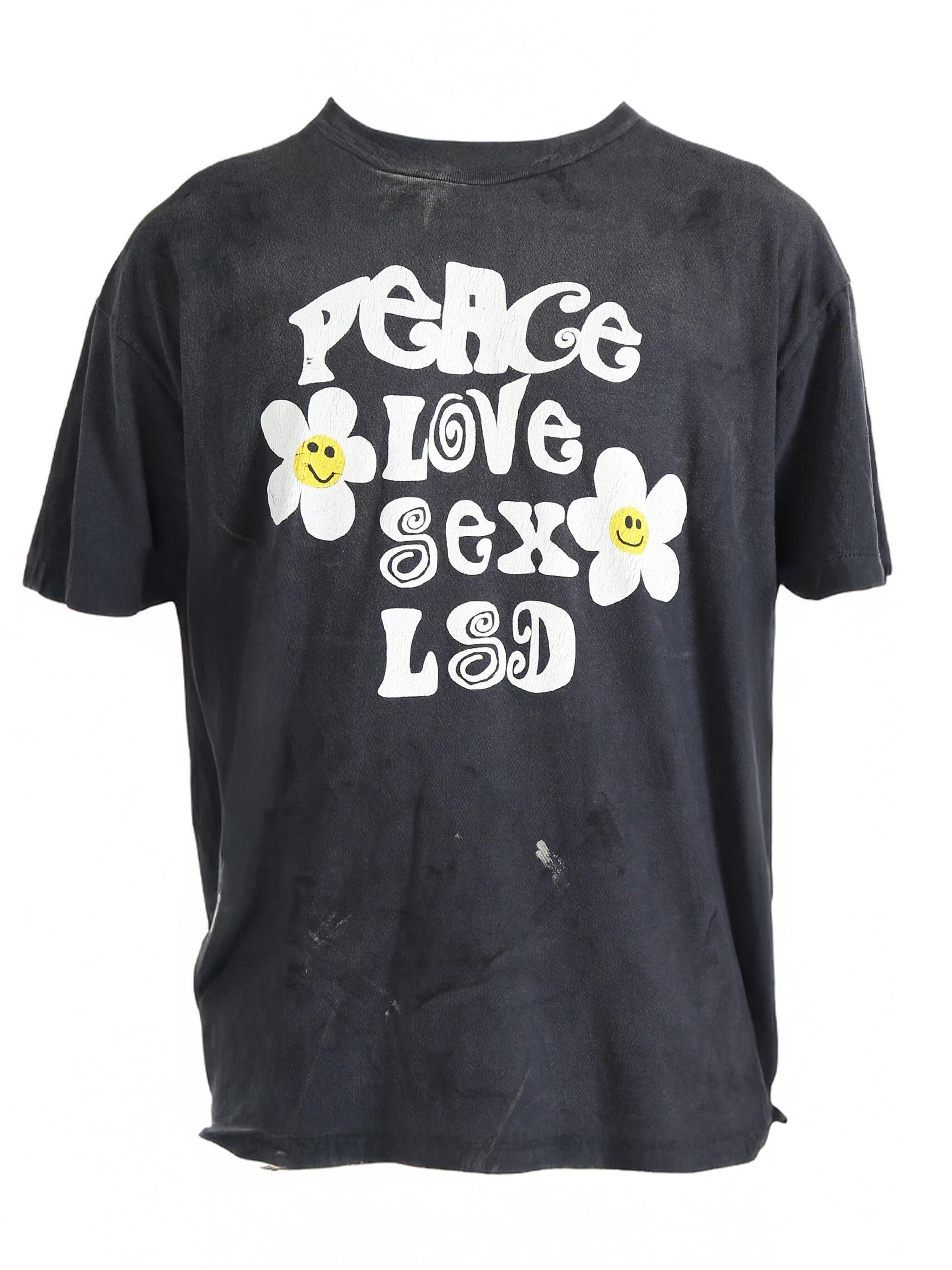 STAY COMFORTABLE AND STYLISH WITH OUR PEACE COTTON T-SHIRT. MADE FROM SOFT BLACK COTTON AND FEATURING A UNIQUE GRAPHIC PRINT ON THE FRONT AND LOGO ON THE BACK, THIS UNISEX SHIRT IS PERFECT FOR ANY OCCASION. ITS FADED EFFECT AND CLASSIC CREW NECK MAKE IT A MUST-HAVE IN YOUR WARDROBE.