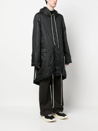 FISHTAIL HOODED RAINCOAT FROM RICK OWENS DRKSHDW FEATURING BLACK, FISHTAIL DESIGN, DRAWSTRING HOOD, CONCEALED FRONT FASTENING, TWO FRONT FLAP POCKETS, LONG SLEEVES AND DRAWSTRING HEM.