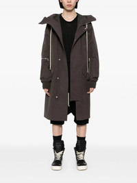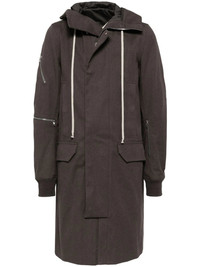 ASH BROWN COTTON FRONT ZIP FASTENING FRONT PRESS-STUD FASTENING DRAWSTRING HOOD TWO FRONT WELT POCKETS DECORATIVE ZIP DETAILING LONG SLEEVES TWO FRONT FLAP POCKETS STRAIGHT HEM FULL LINING INTERNAL ZIP-FASTENING POCKET CALF-LENGTH