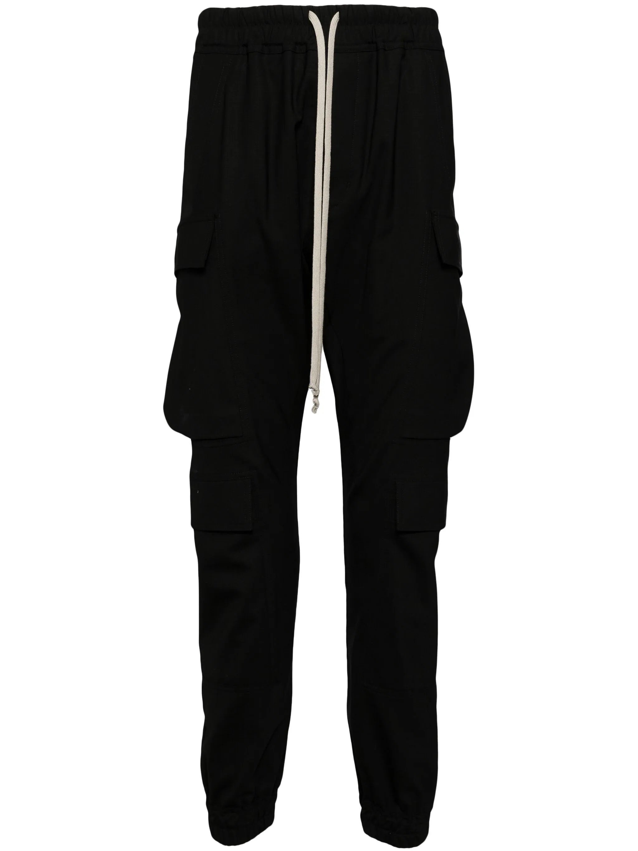 BLACK VIRGIN WOOL BLEND ELASTICATED DRAWSTRING WAISTBAND TWO SIDE FLAP POCKETS TWO SIDE CARGO POCKETS TWO REAR BUTTON-FASTENING POCKETS ELASTICATED HEM