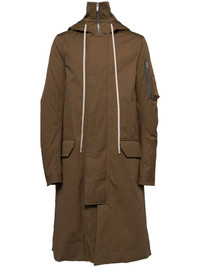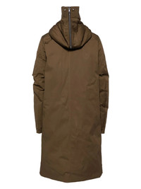 BEAN GREEN PADDED DESIGN ORGANIC COTTON BLEND CONCEALED PRESS-STUD FASTENING CONCEALED FRONT ZIP FASTENING DRAWSTRING HOOD ZIPPED HOOD FUNNEL NECK LONG SLEEVES SLEEVE ZIP POCKET TWO FRONT WELT POCKETS TWO FRONT FLAP POCKETS COTTON LINING INTERNAL ZIP-FASTENING POCKETS STRAIGHT FIT BELOW-KNEE LENGTH