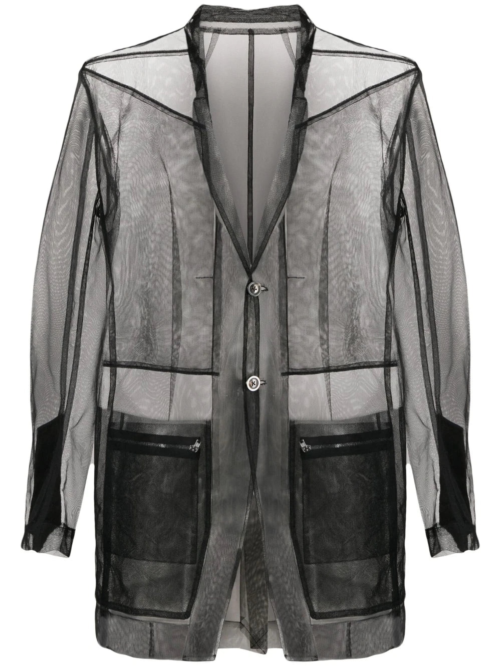 SHEER BUTTONED SHIRT FROM RICK OWENS FEATURING BLACK, SEMI-SHEER CONSTRUCTION, VERTICAL SEAMED, COLLARLESS, FRONT BUTTON FASTENING, LONG SHEER SLEEVES, FRONT ZIP FASTENING POCKETS AND STRAIGHT HEM.