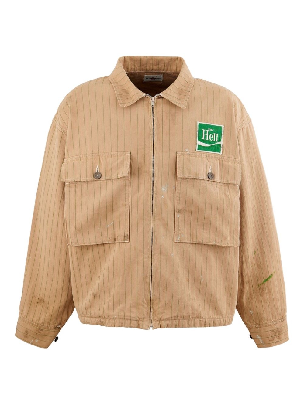 THIS BEIGE PINSTRIPE ZIP-UP JACKET COMBINES CLASSIC TAILORING WITH MODERN DETAILS. IT FEATURES TWO FRONT FLAP POCKETS FOR PRACTICAL STORAGE AND AN EMBROIDERED LOGO PATCH THAT ADDS SUBTLE BRANDING. THE ZIP FASTENING ENSURES EASY WEAR, WHILE DROPPED SHOULDER SEAMS PROVIDE A RELAXED, CONTEMPORARY SILHOUETTE.