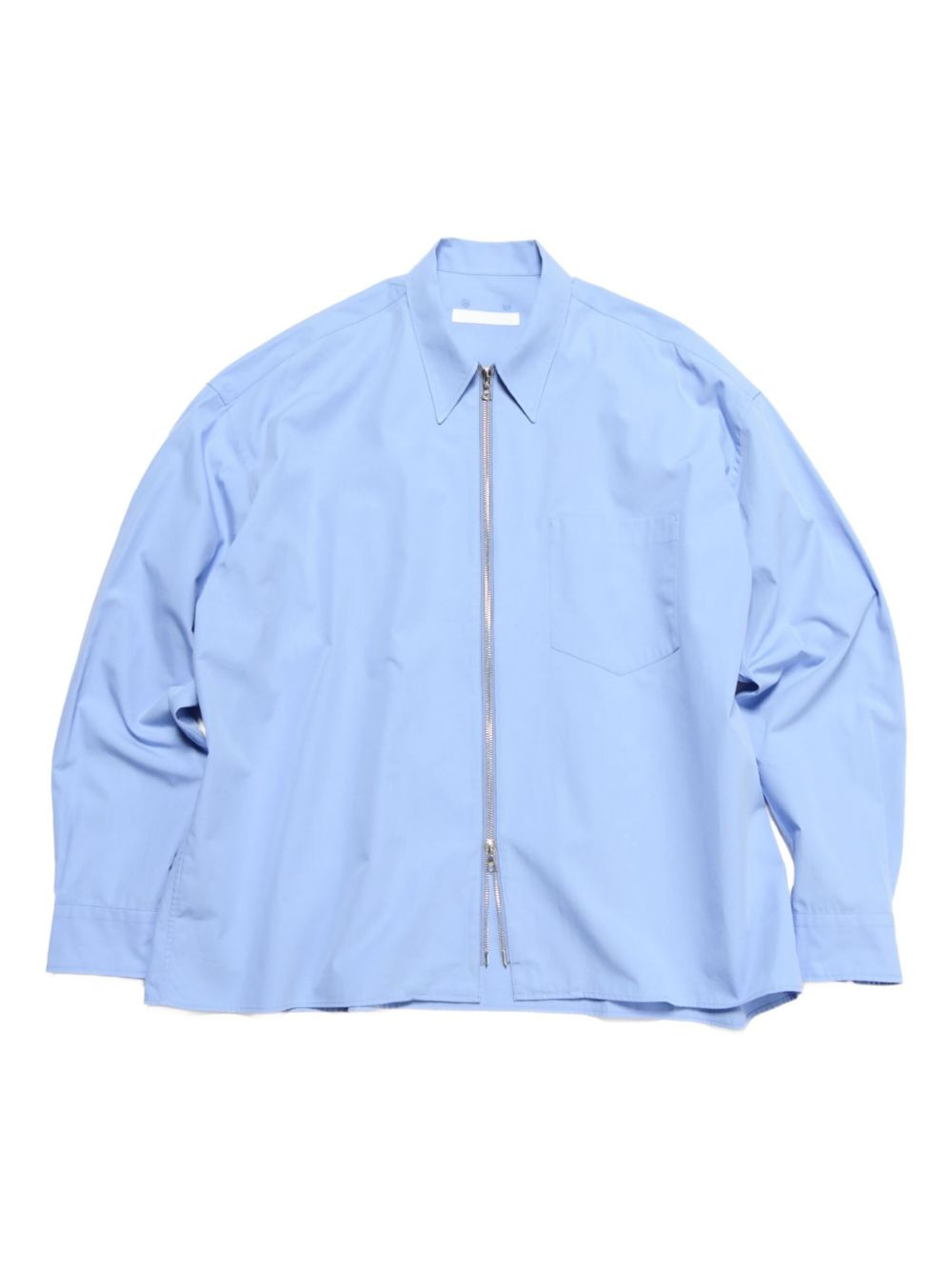 THIS SKY BLUE OVERSHIRT FEATURES A POINTED COLLAR AND A ZIP FASTENING FOR A SLEEK, MODERN LOOK. DESIGNED WITH LONG SLEEVES AND A SINGLE CHEST POCKET, IT COMBINES PRACTICALITY WITH REFINED STYLE, MAKING IT A VERSATILE ADDITION TO ANY WARDROBE.