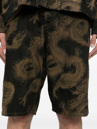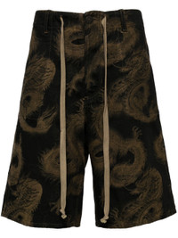 BROWN/BLACK COTTON DRAGON PRINT DRAWSTRING WAIST FRONT BUTTON AND ZIP FASTENING BELT LOOPS TWO SIDE INSET POCKETS TWO REAR BUTTON-FASTENING POCKETS STRAIGHT HEM