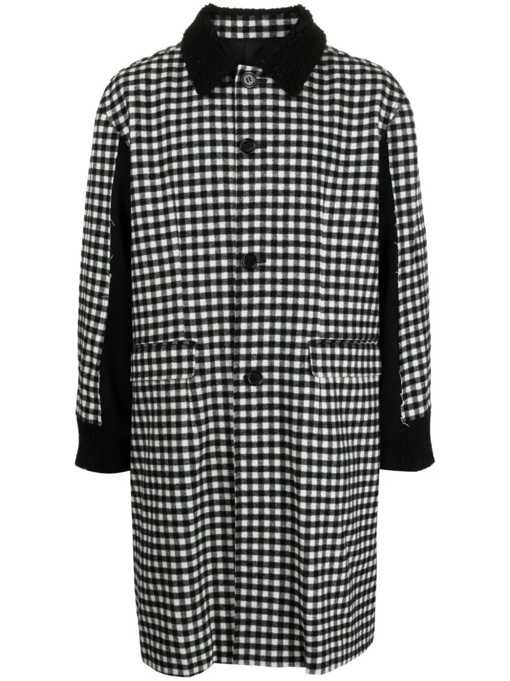 BLACK/WHITE CHECK PRINT CONTRASTING COLLAR FRONT BUTTON FASTENING DROP SHOULDER LONG SLEEVES RIBBED CUFFS TWO FRONT FLAP POCKETS STRAIGHT HEM MID-LENGTH