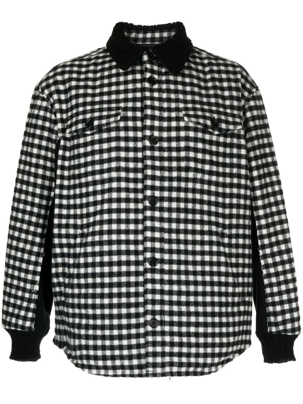 BLACK/WHITE WOOL BLEND/WOOL/COTTON/MOHAIR-WOOL BLEND FLANNEL GINGHAM CHECK PATTERN FAUX-SHEARLING TRIM CLASSIC COLLAR FRONT BUTTON FASTENING DROP SHOULDER LONG SLEEVES RIBBED CUFFS TWO CHEST FLAP POCKETS TWO FRONT WELT POCKETS CURVED HEM QUILTED LINING