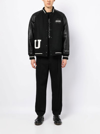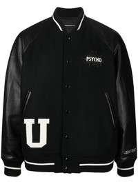 X PSYCHO PATCH BOMBER JACKET FROM UNDERCOVER FEATURING BLACK/WHITE, WOOL BLEND, STAND-UP COLLAR, PATCHWORK DETAILING, TWO FRONT WELT POCKETS, PRESS-STUD FASTENING AND LONG SLEEVES. ©UNIVERSAL CITY STUDIOS LLC. ALL RIGHTS RESERVED.