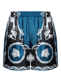THESE SILK SHORTS SHOWCASE THE EXQUISITE LA COUPE DES DIEUX PRINT IN STRIKING BLUE, BLACK, AND SILVER TONES. THE ELASTICATED WAISTBAND ENSURES COMFORTABLE, ADJUSTABLE WEAR THROUGHOUT THE DAY, WHILST THE PREMIUM SILK FABRIC DELIVERS A LUXURIOUS DRAPE AND BREATHABLE FINISH. PERFECT FOR WARM-WEATHER DRESSING, THIS PIECE BALANCES ARTISTIC SOPHISTICATION WITH PRACTICAL COMFORT. THE REFINED PRINT AND FLUID CONSTRUCTION MAKE THESE SHORTS AN ELEGANT CHOICE FOR RESORT WEAR OR ELEVATED CASUAL OCCASIONS WHERE QUALITY FABRICATION AND DISTINCTIVE DESIGN CONVERGE.