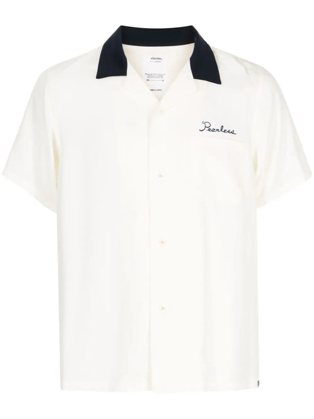 HACKING SHORT-SLEEVE SILK SHIRT FROM VISVIM FEATURING IVORY WHITE, PRUSSIAN BLUE, SILK, EMBROIDERED MOTIF, EMBROIDERED SLOGAN, CONTRASTING COLLAR, CAMP COLLAR, FRONT BUTTON FASTENING, SHORT SLEEVES, CHEST PATCH POCKET AND STRAIGHT HEM.