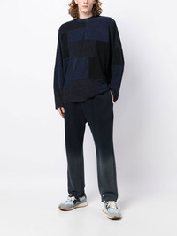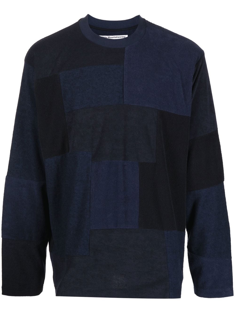 SLOUCHY PANELED JUMPER FROM WHITE MOUNTAINEERING FEATURING NAVY BLUE, BLACK, COLOUR-BLOCK PANELLED DESIGN, SLOUCH BODY, CREW NECK, EXTRA-LONG SLEEVES AND STRAIGHT HEM.