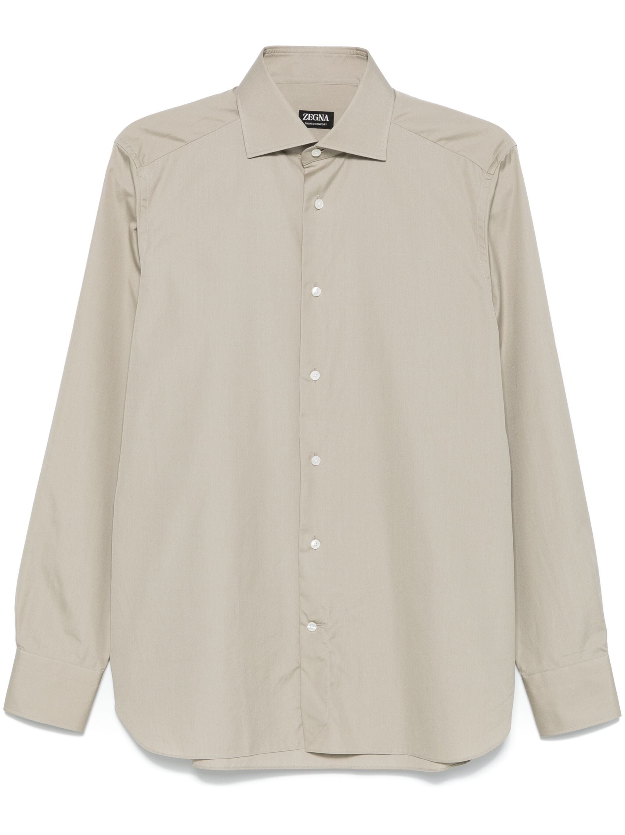 EXPERTLY CRAFTED FROM SOFT SAGE GREEN COTTON WITH A TEXTURED POPLIN FINISH, THIS SHIRT OFFERS A SOPHISTICATED AND TIMELESS LOOK. THE FRONT BUTTON FASTENING, CUTAWAY COLLAR, AND CURVED HEM PROVIDE A POLISHED AND VERSATILE STYLE, WHILE THE LONG SLEEVES WITH BUTTONED CUFFS ADD A TOUCH OF REFINEMENT. PERFECT FOR ANY OCCASION.