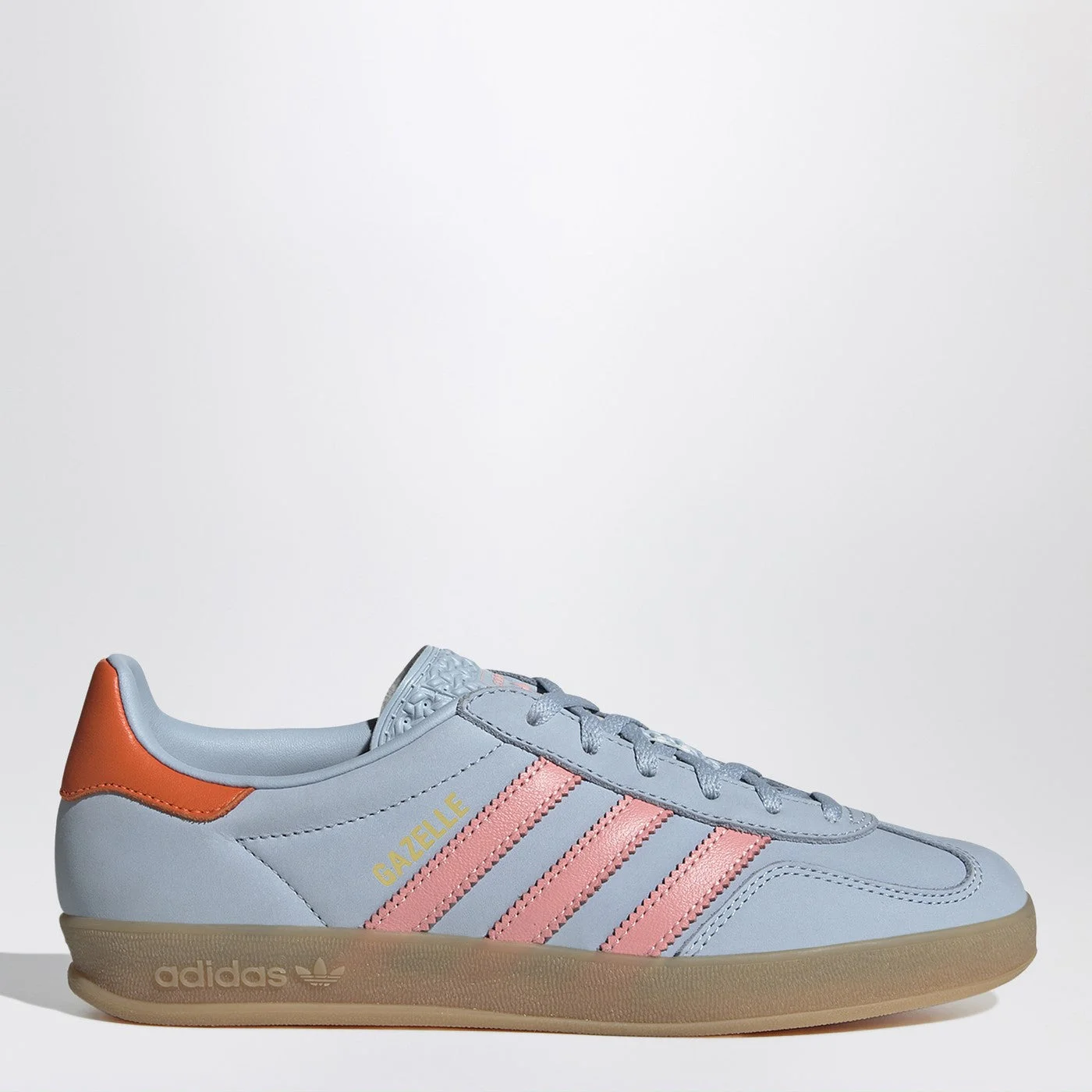 Adidas Originals sneaker in Wonder Blue leather featuring a rounded toe pink side stripes lace-up closure orange heel logo tongue and rubber sole.