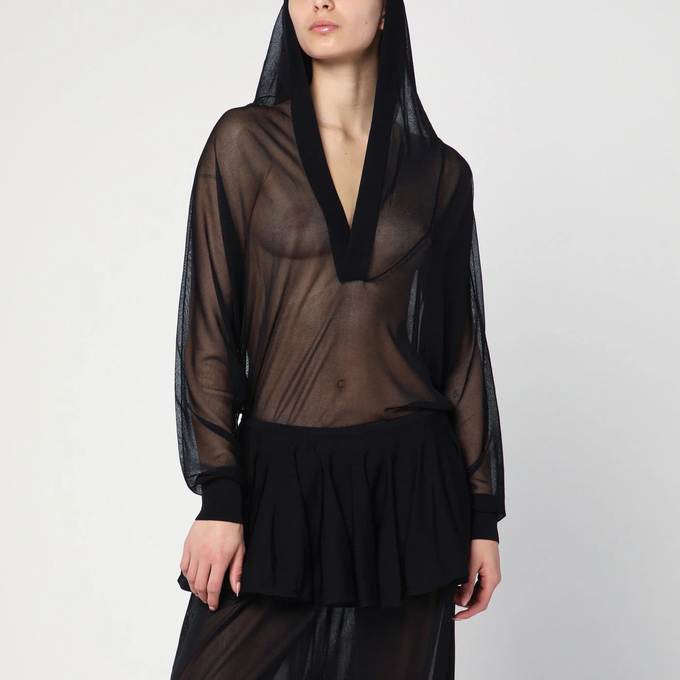 Alaia body in black viscose blend knit characterized by a semi-transparent design a large hood long sleeves with ribbed cuffs and a loose fit.