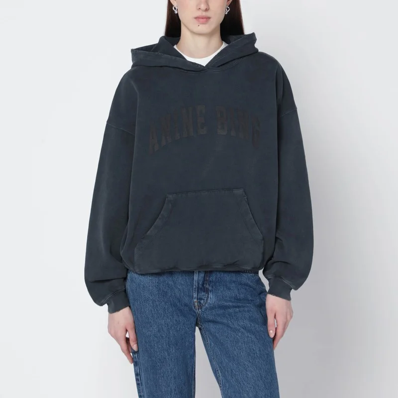 Olive green cotton hoodie from Anine Bing featuring a contrasting lettering logo print on the front, long, low-shoulder sleeves, ribbed cuffs and hem, and a pouch pocket with wear on the front.