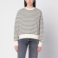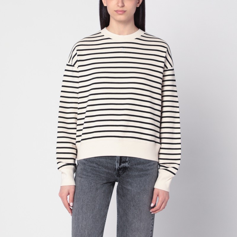 Anine Bing crew neck sweatshirt in ivory cotton blend with black stripes, featuring long sleeves, tone-on-tone logo embroidery on the chest, ribbed edges, and a relaxed fit.
