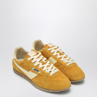 Autry sneakers in shaved suede Mineral Yellow color featuring contrasting leather details flat cotton laces tongue with logo label padded collar round toe leather and cotton sponge lining mesh-lined elevated insole and rubber sole.