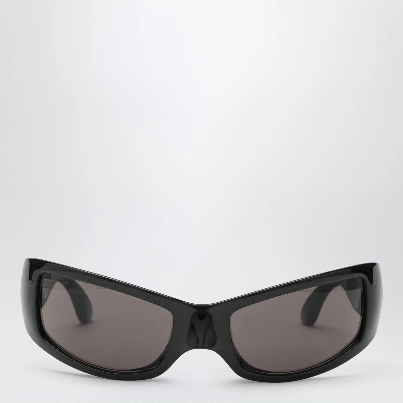 Black acetate sunglasses by Balenciaga featuring logo lettering on the temples and grey lenses.