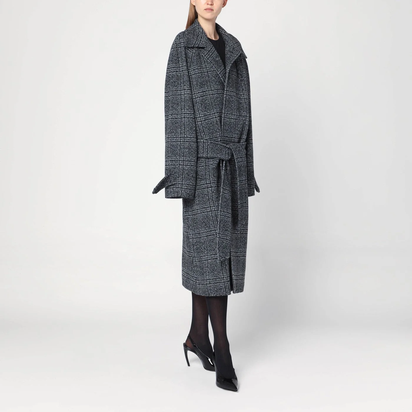 Balenciaga coat in grey and black checked wool featuring long raglan sleeves a waist belt two cut pockets on the front tabs on the collar and sleeves a slit at the back and ankle-length.