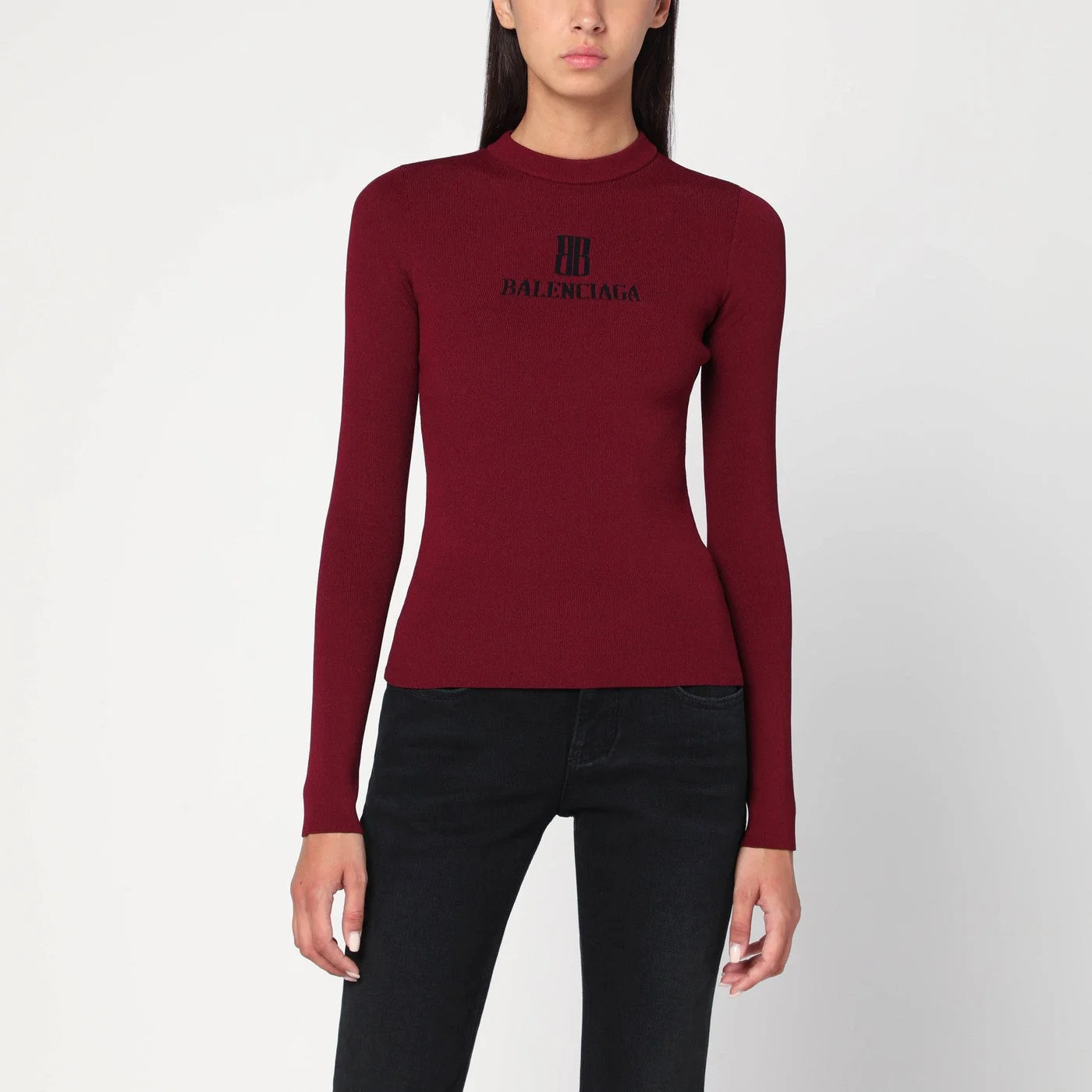 Balenciaga sweater in burgundy viscose blend featuring long sleeves ribbed fitted design contrasting logo on the chest and a high collar.