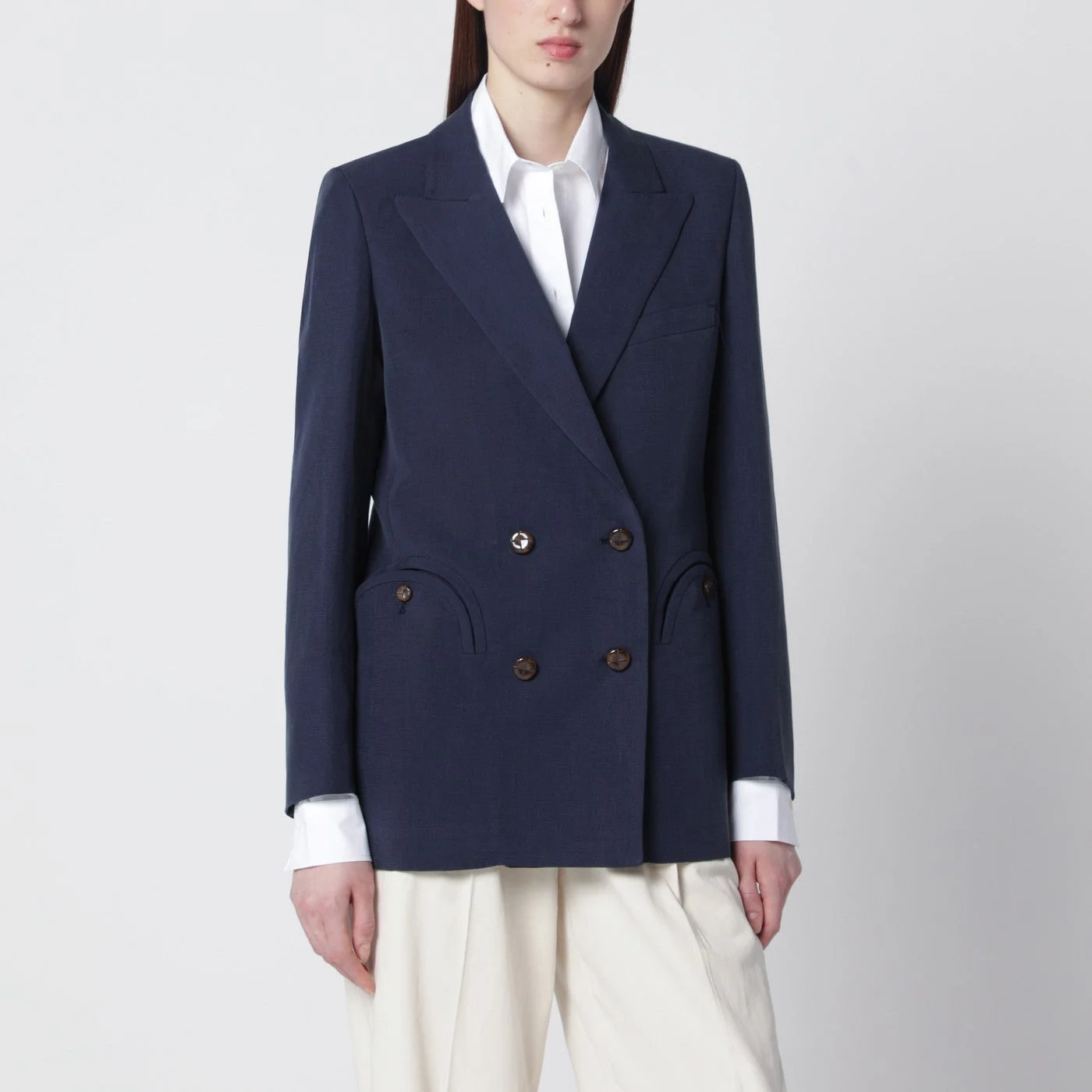 Double-breasted jacket by Blaze Milano in navy blue linen and silk featuring front button fastening long sleeves with buttoned cuffs one chest welt pocket two Smiley pockets with button on the front back vent and lightly padded shoulders.