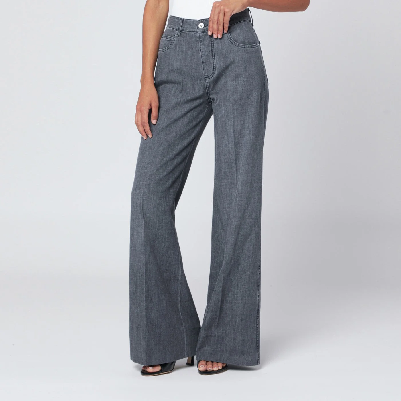 Bottega Veneta wide-leg jeans in black cotton denim with a faded effect characterized by a wide-leg design high waist belt loops five pockets and a leather label with Intrecciato pattern on the back.