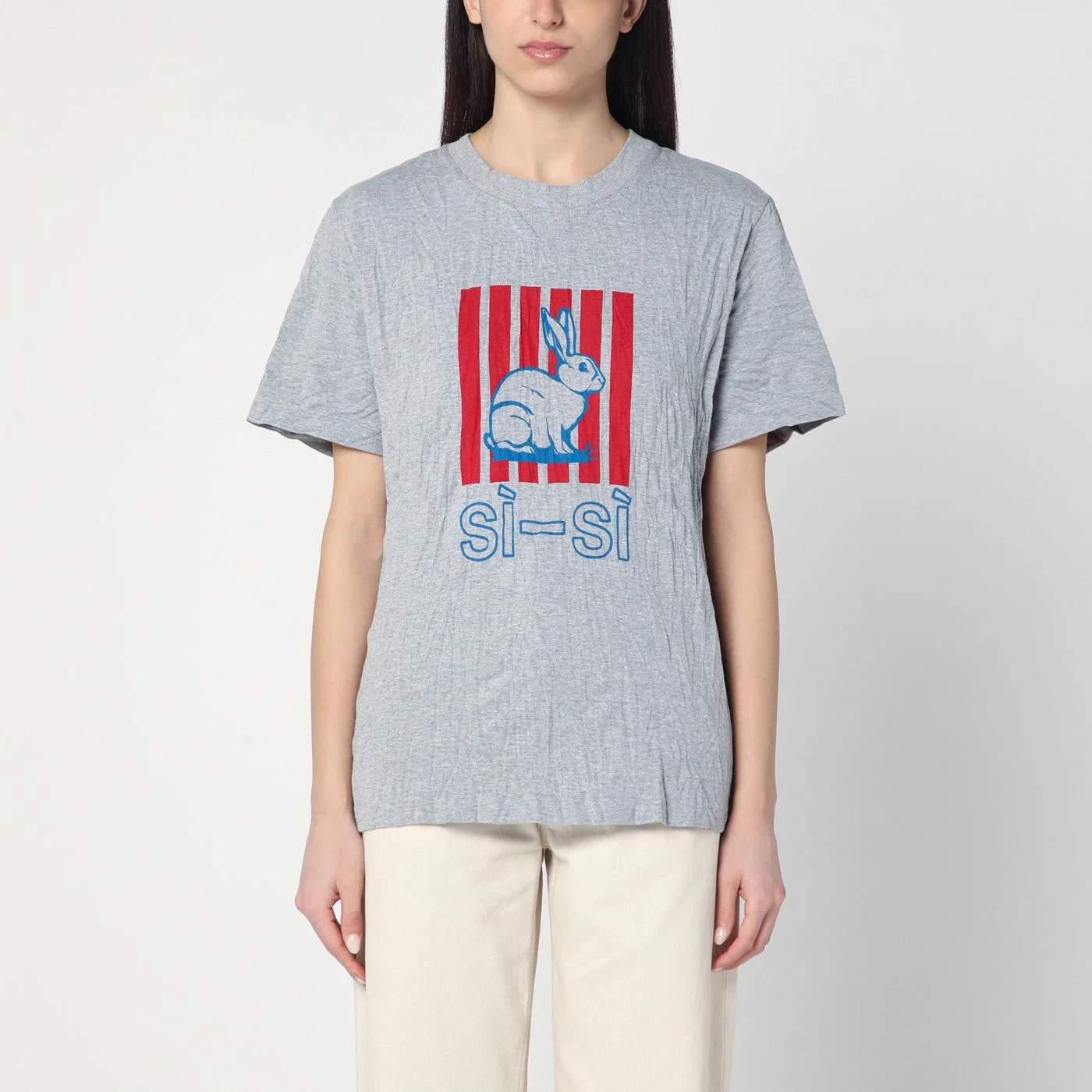 T-shirt by Bottega Veneta in grey technical cotton jersey blend with crushed effect featuring graphic rabbit print SI-SI print crushed effect and regular fit.