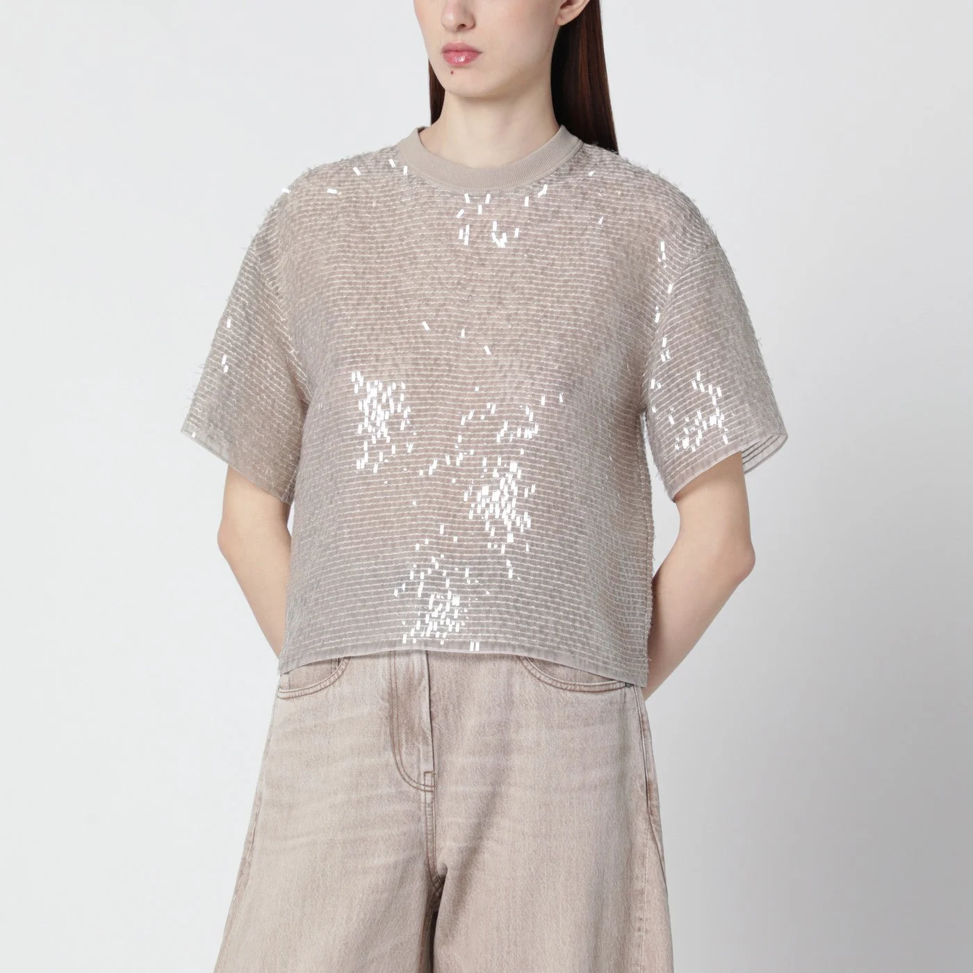 T-shirt by Brunello Cucinelli with Crispy silk base and rectangular micro-sequin embroidery featuring a ribbed crew neck short sleeves and back button closure.