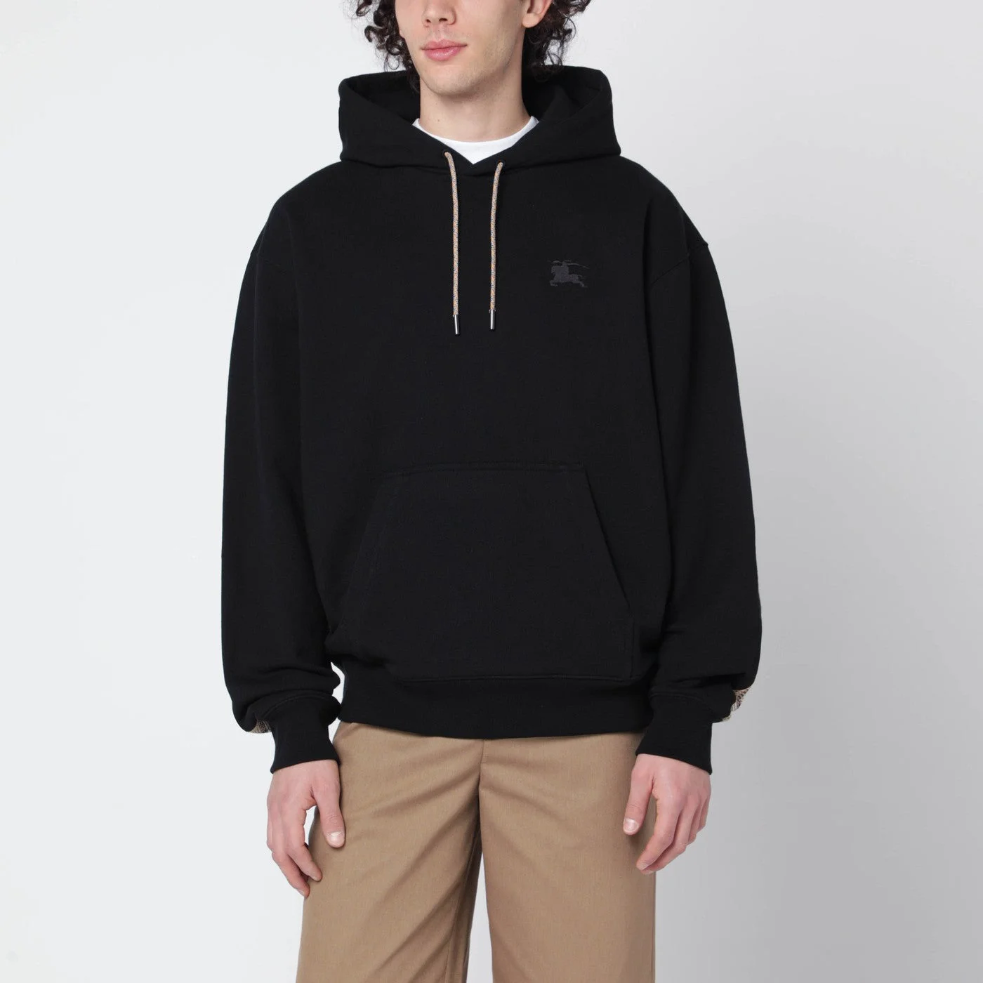 Hoodie by Burberry in black cotton• Drawstring hood with Check pattern• Tone-on-tone embroidered Equestrian Knight Design logo on the chest• Front kangaroo pocket• Ribbed trims• Long sleeves with beige Check detail on the back
