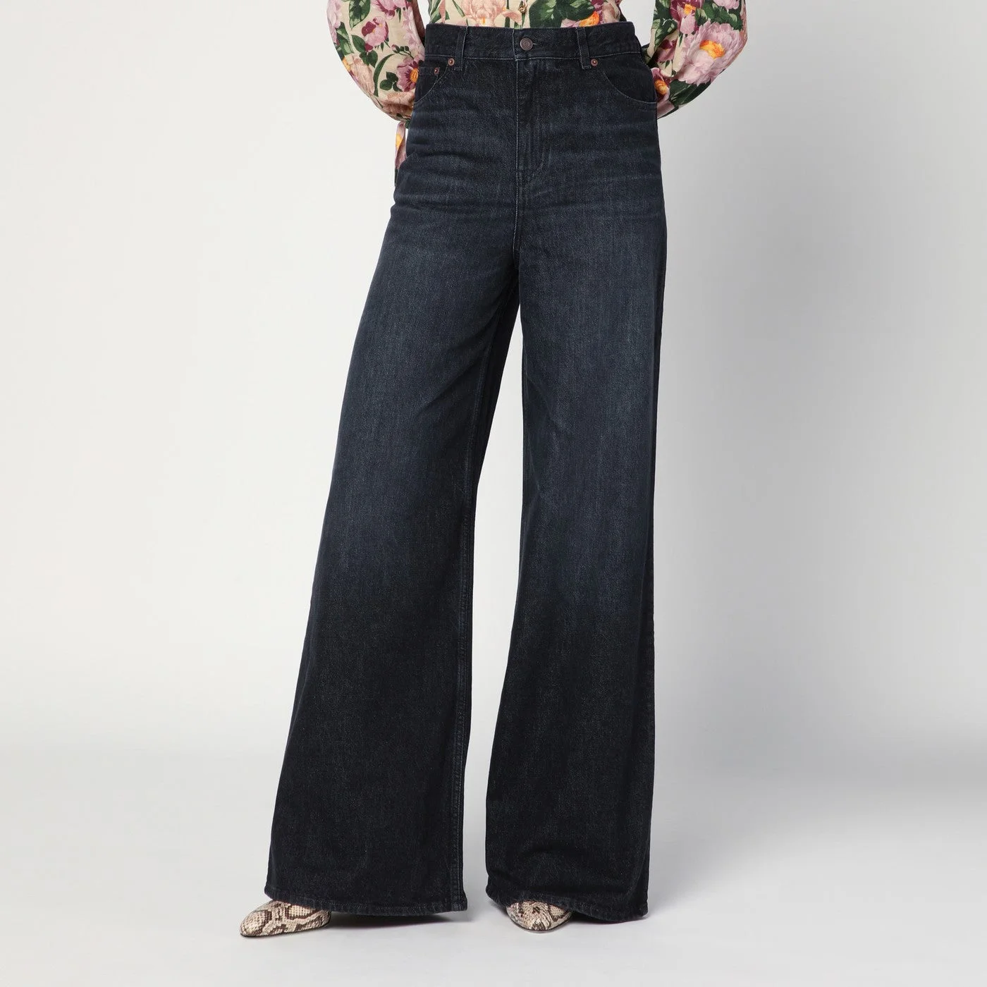 Chloe wide jeans in black cotton denim with a faded effect characterized by a high waist with belt loops front closure with zip and button and five classic pockets including one back pocket with a leather logo lettering detail.