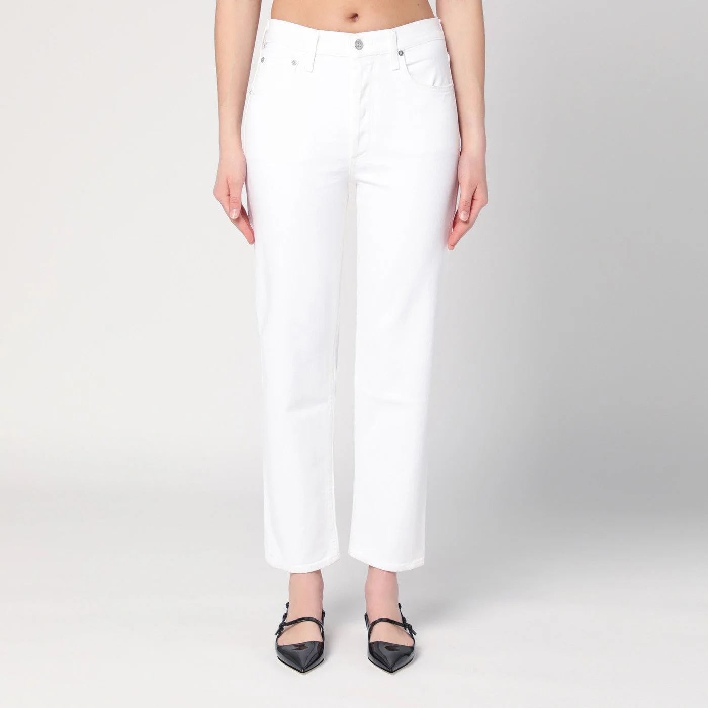 Citizens of Humanity jeans in white cotton denim featuring a front zip and button closure belt loops five classic pockets a back logo patch and a small logo tag.