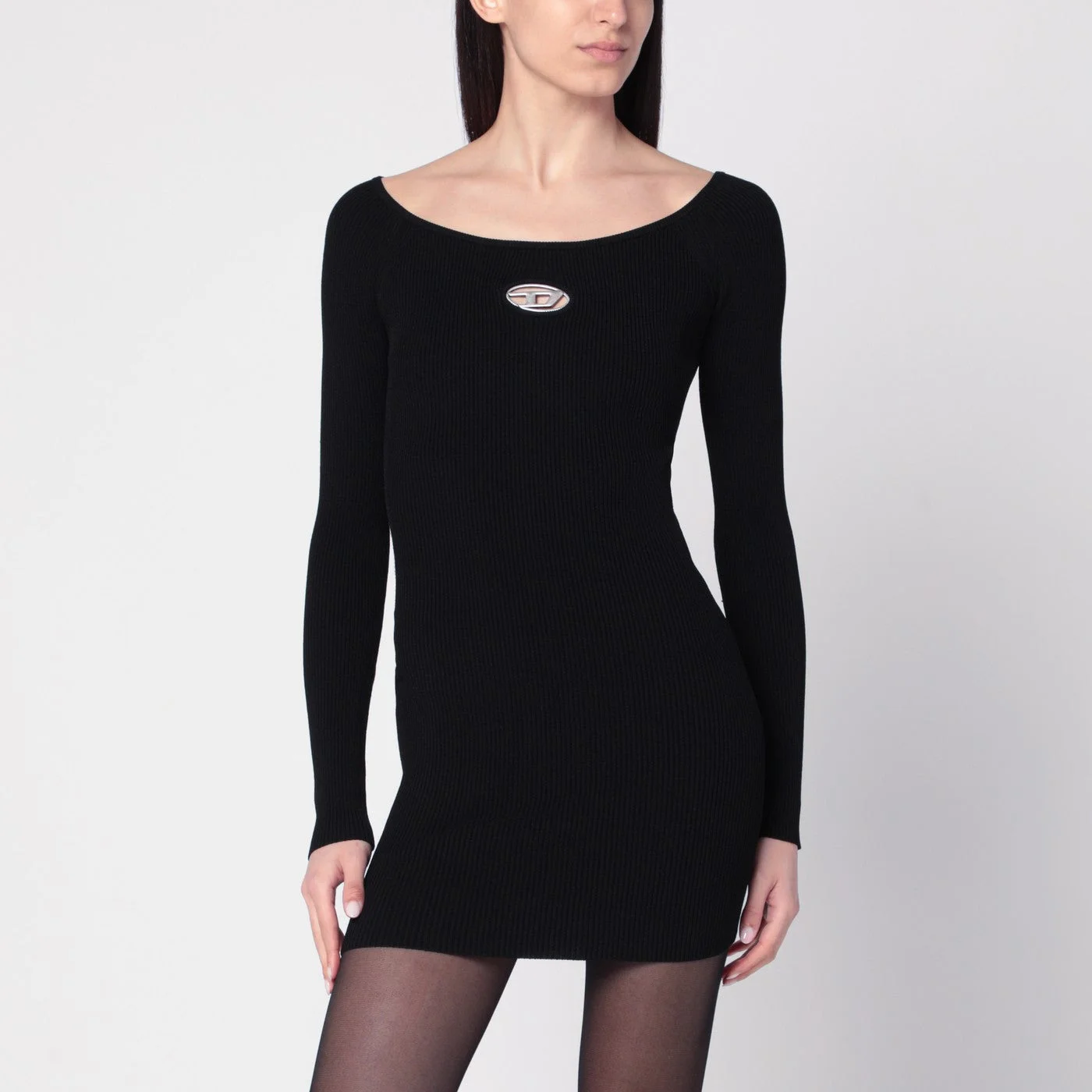 Black viscose jersey mini dress by Diesel characterized by ribbed design wide round neck long sleeves metal Oval D logo on the chest and fitted silhouette.