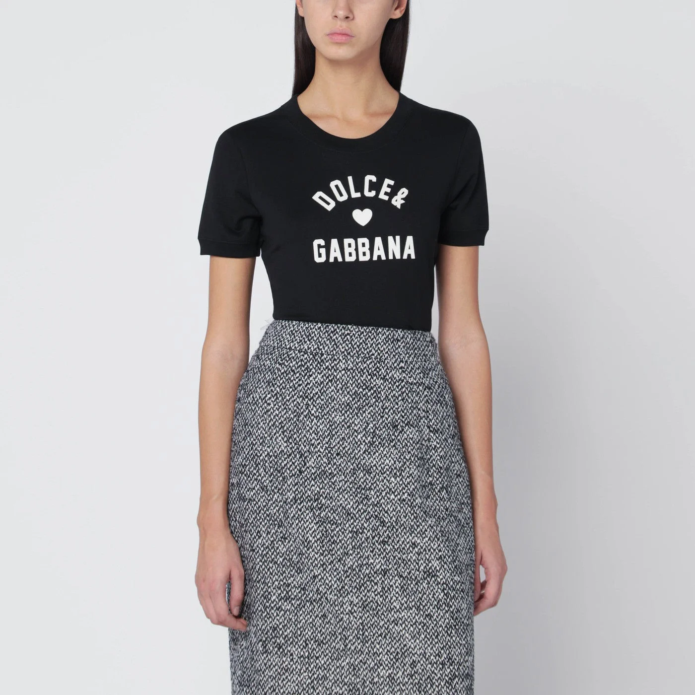 Black cotton T-shirt by Dolce & Gabbana featuring a ribbed crew neck short sleeves and contrasting logo lettering embroidery on the front.