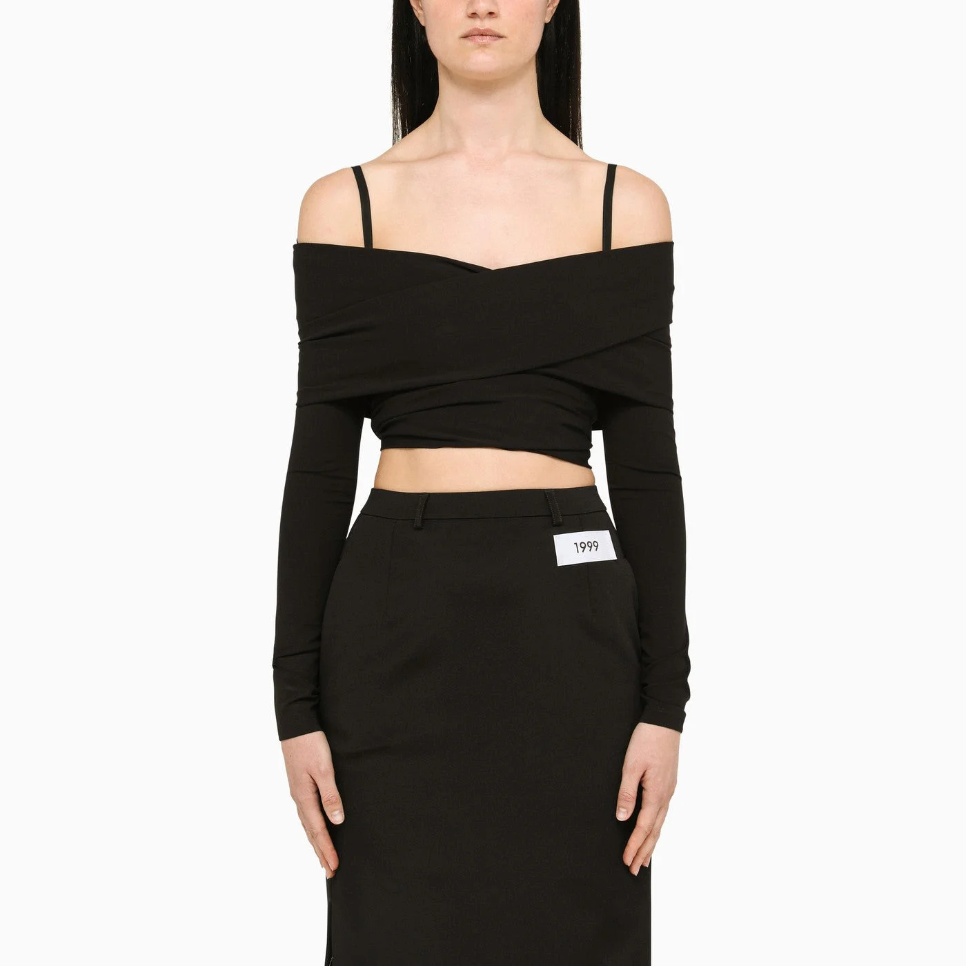 Black viscose short top from Dolce & Gabbana featuring a boat neckline crossover back and long sleeves.