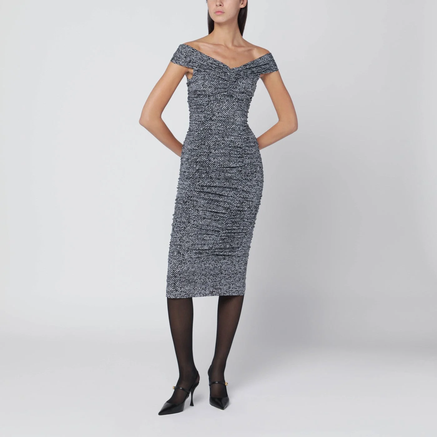 Midi dress by Dolce & Gabbana in silk blend with black and white diagonal print featuring a fitted draped design off-the-shoulder style and a zip closure at the back.
