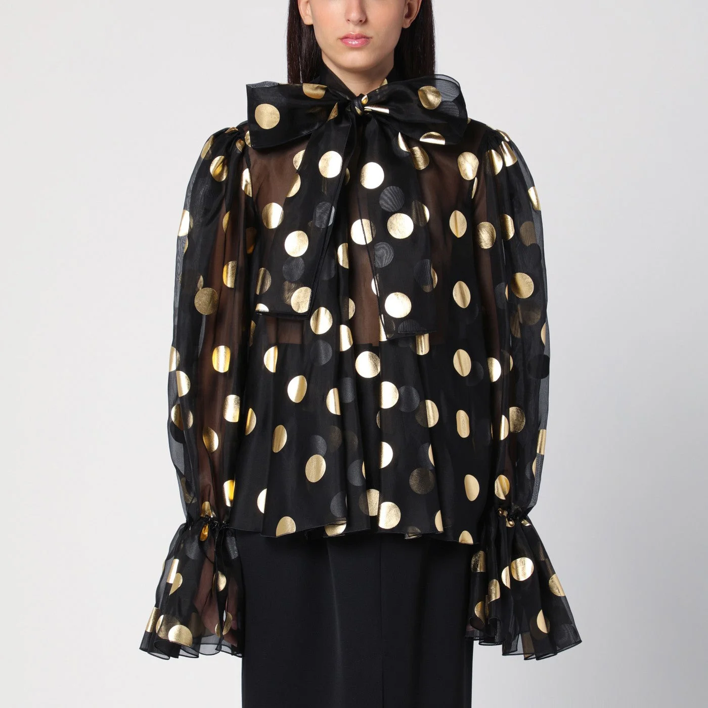 Black lame polka dot jacquard silk organza blouse from Dolce & Gabbana featuring a round neckline with a knotted scarf bow long sleeves with elasticated and ruffled cuffs and a back neck fastening with snap buttons.
