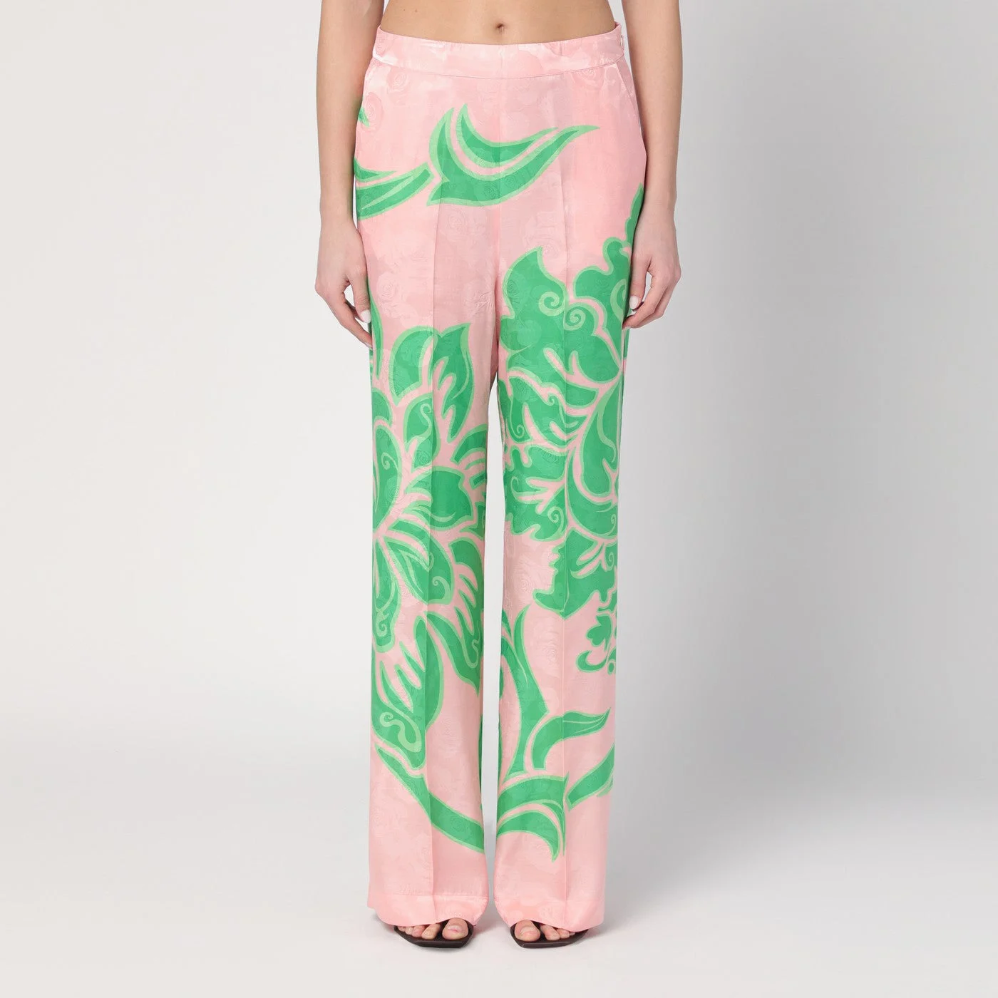 Wide Etro pants in pink silk blend with a print in shades of green characterized by a high elasticized waist at the back and two side welt pockets.